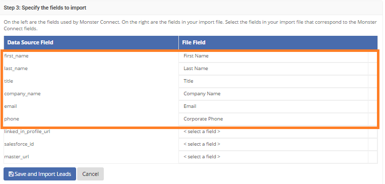 Step 8: Save and Import : Once you have mapped your fields "Click Save and Import Leads"