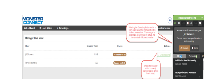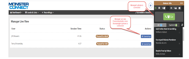 3. Selecting the Eavesdropping button allows the manager to listen to the user’s conversation.