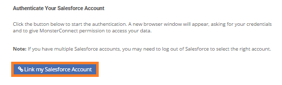 Step 6 - Click "Link To My Salesforce Account" You will be asked to login to Salesforce.com. Once you have successfully logged in MonsterConnect you will be prompted to select "continue".