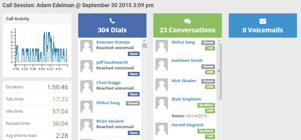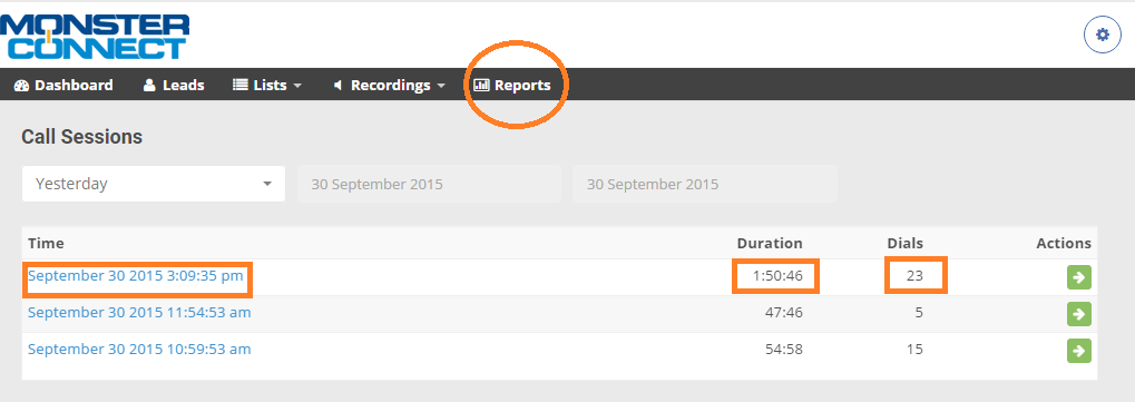 By Clicking on the report tab you can access your session reports based on when you logged in. This report displays time you logged in, Duration, and dials (Connections).
